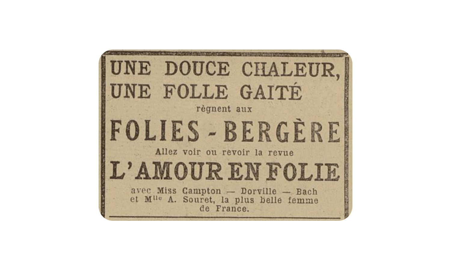 À la disparition de Paul Derval, sa femme prend la direction du théâtre. Durant cinq décennies à la tête des Folies Bergère, Derval aura produit 29 revues, affirmant son rôle de véritable précurseur du genre. Parmi elles, Ah ! Quelle Folie restera dans les mémoires comme la revue la plus longue de l’histoire du théâtre, jouée sans interruption pendant près de six ans.
